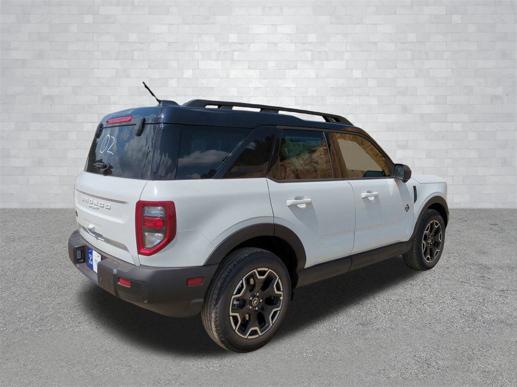 2025 Oxford White 2025 Ford Bronco Sport Outer Banks 4WD 1.5L EcoBoost 4-Wheel Disc Brakes, 6 Speakers, ABS brakes, Air Conditioning, Alloy wheels, AM/FM radio: SiriusXM, AM/FM Stereo, Auto High-beam Headlights, Auto-dimming Rear-View mirror, Automatic temperature control, Brake assist, Compass, Delay-off headlights, Driver door bin, Driver vanity mirror, Dual front impact airbags, Dual front side impact airbags, Electronic Stability Control, Emergency communication system: SYNC 4 911 Assist, Four wheel independent suspension, Front anti-roll bar, Front Bucket Seats, Front Center Armrest, Front Driver/Passenger Seat Back Map Pockets, Front dual zone A/C, Front fog lights, Front reading lights, Fully automatic headlights, Garage door transmitter, Heated door mirrors, Heated front seats, Heated steering wheel, Illuminated entry, Knee airbag, Low tire pressure warning, Memory seat, Occupant sensing airbag, Outside temperature display, Overhead airbag, Overhead console, Panic alarm, Passenger door bin, Passenger vanity mirror, Power door mirrors, Power driver seat, Power passenger seat, Power steering, Power windows, Premium Trimmed Front Bucket Seats w/Ebony/Roast, Radio data system, Rain sensing wipers, Rear anti-roll bar, Rear Parking Sensors, Rear reading lights, Rear seat center armrest, Rear window defroster, Rear window wiper, Remote keyless entry, Security system, SiriusXM, Speed control, Speed-sensing steering, Speed-Sensitive Wipers, Split folding rear seat, Steering wheel mounted audio controls, SYNC 4 w/Enhanced Voice Recognition, Tachometer, Telescoping steering wheel, Tilt steering wheel, Traction control, Trip computer, Variably intermittent wipers, and Wheels: 18" Ebony Black-Painted Aluminum Courtesy Ford and Lincoln of Rome 101 Hwy 411 E Rome, Ga 30161 ROMEFORDLINC.COM 706.235.4453.