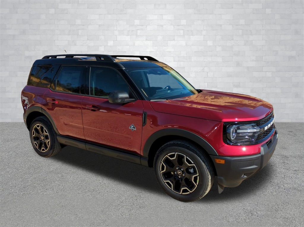 2025 Ruby Red Metallic Tinted Clearcoat 2025 Ford Bronco Sport Outer Banks 4WD 1.5L EcoBoost 4-Wheel Disc Brakes, 6 Speakers, ABS brakes, Air Conditioning, Alloy wheels, AM/FM radio: SiriusXM, AM/FM Stereo, Auto High-beam Headlights, Auto-dimming Rear-View mirror, Automatic temperature control, Brake assist, Compass, Delay-off headlights, Driver door bin, Driver vanity mirror, Dual front impact airbags, Dual front side impact airbags, Electronic Stability Control, Emergency communication system: SYNC 4 911 Assist, Four wheel independent suspension, Front anti-roll bar, Front Bucket Seats, Front Center Armrest, Front Driver/Passenger Seat Back Map Pockets, Front dual zone A/C, Front fog lights, Front reading lights, Fully automatic headlights, Garage door transmitter, Heated door mirrors, Heated front seats, Heated steering wheel, Illuminated entry, Knee airbag, Low tire pressure warning, Memory seat, Occupant sensing airbag, Outside temperature display, Overhead airbag, Overhead console, Panic alarm, Passenger door bin, Passenger vanity mirror, Power door mirrors, Power driver seat, Power passenger seat, Power steering, Power windows, Premium Trimmed Front Bucket Seats w/Ebony/Roast, Radio data system, Rain sensing wipers, Rear anti-roll bar, Rear Parking Sensors, Rear reading lights, Rear seat center armrest, Rear window defroster, Rear window wiper, Remote keyless entry, Security system, SiriusXM, Speed control, Speed-sensing steering, Speed-Sensitive Wipers, Split folding rear seat, Steering wheel mounted audio controls, SYNC 4 w/Enhanced Voice Recognition, Tachometer, Telescoping steering wheel, Tilt steering wheel, Traction control, Trip computer, Variably intermittent wipers, and Wheels: 18" Ebony Black-Painted Aluminum Courtesy Ford and Lincoln of Rome 101 Hwy 411 E Rome, Ga 30161 ROMEFORDLINC.COM 706.235.4453.