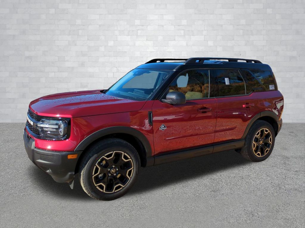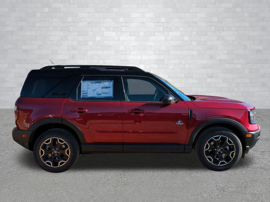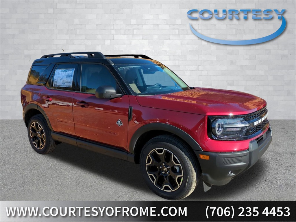 2025 Ruby Red Metallic Tinted Clearcoat 2025 Ford Bronco Sport Outer Banks 4WD 1.5L EcoBoost Equipment Group 300A, 4-Wheel Disc Brakes, 6 Speakers, ABS brakes, Air Conditioning, Alloy wheels, AM/FM radio: SiriusXM, AM/FM Stereo, Auto High-beam Headlights, Auto-dimming Rear-View mirror, Automatic temperature control, Brake assist, Compass, Delay-off headlights, Driver door bin, Driver vanity mirror, Dual front impact airbags, Dual front side impact airbags, Electronic Stability Control, Emergency communication system: SYNC 4 911 Assist, Four wheel independent suspension, Front anti-roll bar, Front Bucket Seats, Front Center Armrest, Front Driver/Passenger Seat Back Map Pockets, Front dual zone A/C, Front fog lights, Front License Plate Bracket, Front reading lights, Fully automatic headlights, Garage door transmitter, Heated door mirrors, Heated front seats, Heated steering wheel, Illuminated entry, Knee airbag, Low tire pressure warning, Memory seat, Occupant sensing airbag, Outside temperature display, Overhead airbag, Overhead console, Panic alarm, Passenger door bin, Passenger vanity mirror, Power door mirrors, Power driver seat, Power passenger seat, Power steering, Power windows, Premium Trimmed Front Bucket Seats w/Ebony/Roast, Radio data system, Rain sensing wipers, Rear anti-roll bar, Rear Parking Sensors, Rear reading lights, Rear seat center armrest, Rear window defroster, Rear window wiper, Remote keyless entry, Security system, SiriusXM, Speed control, Speed-sensing steering, Speed-Sensitive Wipers, Split folding rear seat, Steering wheel mounted audio controls, SYNC 4 w/Enhanced Voice Recognition, Tachometer, Telescoping steering wheel, Tilt steering wheel, Traction control, Trip computer, Variably intermittent wipers, and Wheels: 18" Ebony Black-Painted Aluminum Courtesy Ford and Lincoln of Rome 101 Hwy 411 E Rome, Ga 30161 ROMEFORDLINC.COM 706.235.4453.