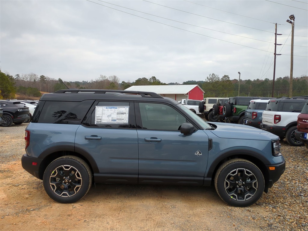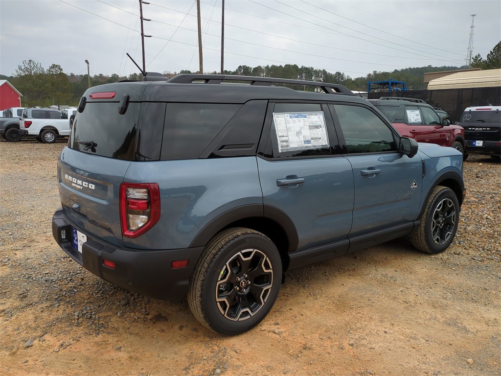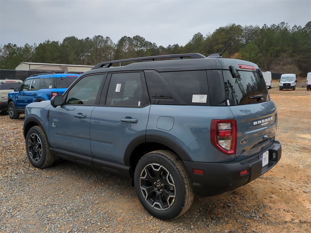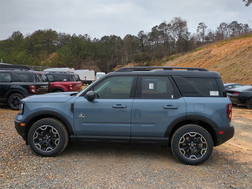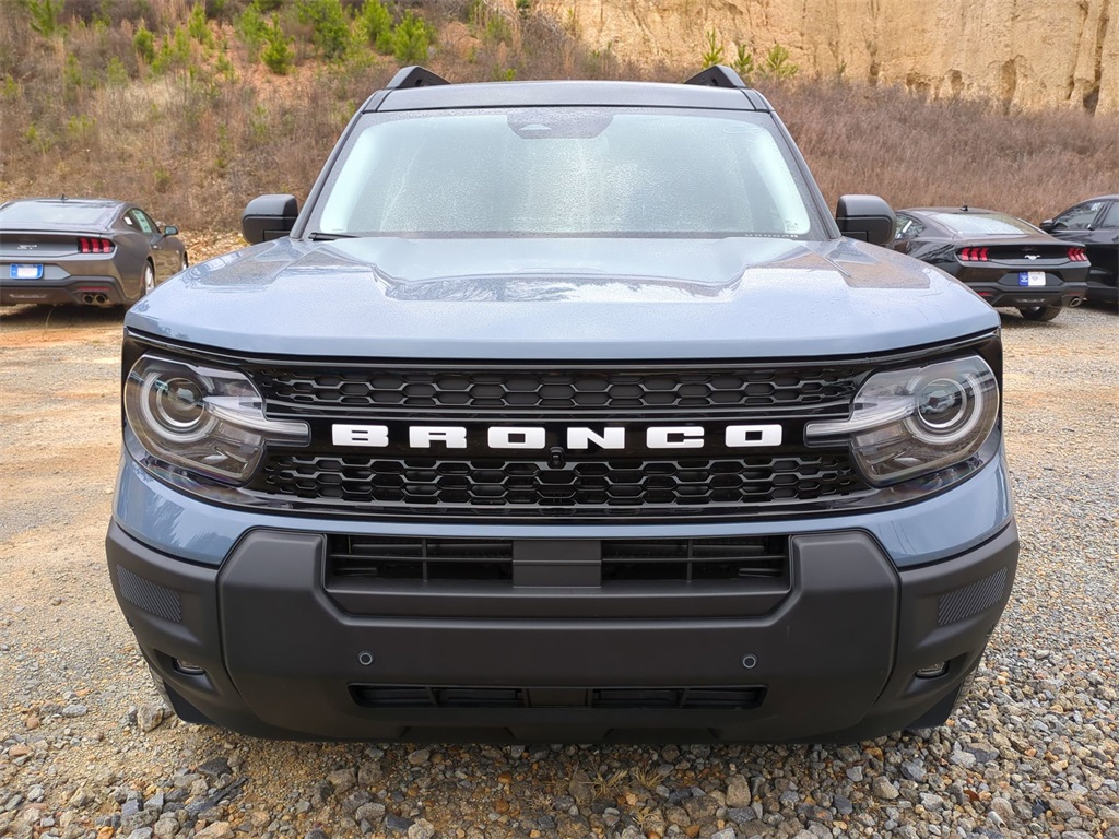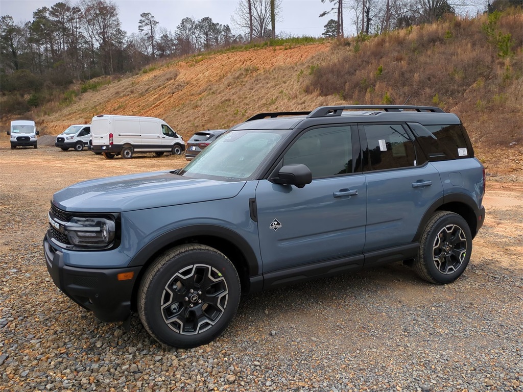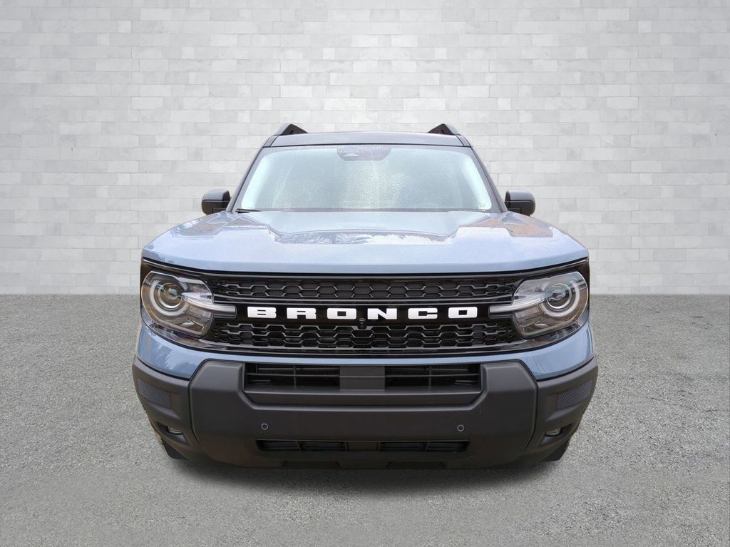 2025 Azure Gray Metallic Tri-Coat 2025 Ford Bronco Sport Outer Banks 4WD 1.5L EcoBoost Equipment Group 300A, Outer Banks Tech Package+ (B&O Sound System by Bang & Olufsen, Connected Navigation, and HD Radio), 360-Degree Camera w/Trail & Split View, 4-Wheel Disc Brakes, 6 Speakers, ABS brakes, Air Conditioning, Alloy wheels, AM/FM radio: SiriusXM, AM/FM Stereo, Auto High-beam Headlights, Auto-dimming Rear-View mirror, Automatic temperature control, Brake assist, Compass, Delay-off headlights, Driver door bin, Driver vanity mirror, Dual front impact airbags, Dual front side impact airbags, Electronic Stability Control, Emergency communication system: SYNC 4 911 Assist, Four wheel independent suspension, Front anti-roll bar, Front Bucket Seats, Front Center Armrest, Front Driver/Passenger Seat Back Map Pockets, Front dual zone A/C, Front fog lights, Front License Plate Bracket, Front Parking Sensors, Front reading lights, Fully automatic headlights, Garage door transmitter, Heated door mirrors, Heated front seats, Heated steering wheel, Illuminated entry, Knee airbag, Low tire pressure warning, Memory seat, Occupant sensing airbag, Outside temperature display, Overhead airbag, Overhead console, Panic alarm, Passenger door bin, Passenger vanity mirror, Power door mirrors, Power driver seat, Power passenger seat, Power steering, Power windows, Premium Trimmed Front Bucket Seats w/Ebony/Roast, Radio data system, Rain sensing wipers, Rear anti-roll bar, Rear Parking Sensors, Rear reading lights, Rear seat center armrest, Rear window defroster, Rear window wiper, Remote keyless entry, Reverse Brake Assist, Security system, SiriusXM, Speed control, Speed-sensing steering, Speed-Sensitive Wipers, Split folding rear seat, Steering wheel mounted audio controls, SYNC 4 w/Enhanced Voice Recognition, Tachometer, Telescoping steering wheel, Tilt steering wheel, Traction control, Trip computer, Variably intermittent wipers, and Wheels: 18" Ebony Black-Painted Aluminum Courtesy Ford and Lincoln of Rome 101 Hwy 411 E Rome, Ga 30161 ROMEFORDLINC.COM 706.235.4453.