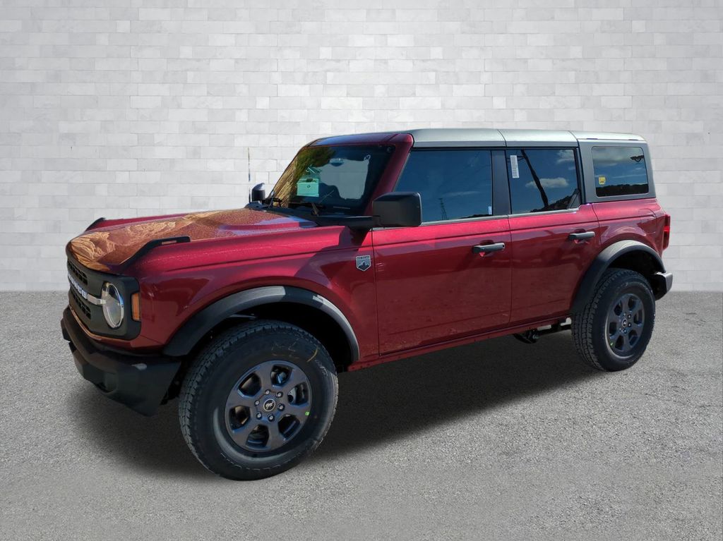 2025 Ruby Red Metallic Tinted Clearcoat 2025 Ford Bronco Big Bend 4WD 2.3L EcoBoost I-4 12" LCD Productivity Touchscreen, Auto Emergency Braking, Auto LED Headlights, Backup Camera, Pre Collision Assist w/ AEB, Push Button Start, Remote Start, Bronco Big Bend, 4D Sport Utility, 4WD, Carbonized Gray Molded-In-Color Hard Top, Equipment Group 222A Mid Package, Hard Top Sound Deadening Headliner, Rear-Window Defroster & Washer. Equipment Group 222A Mid Package (Connected Navigation), Bronco Big Bend, 4D Sport Utility, 4WD, Carbonized Gray Molded-In-Color Hard Top, Hard Top Sound Deadening Headliner, Rear-Window Defroster & Washer, 4-Wheel Disc Brakes, 4.46 Axle Ratio, 7 Speakers, ABS brakes, Air Conditioning, Alloy wheels, AM/FM radio: SiriusXM with 360L, AM/FM Stereo, Auto High-beam Headlights, Brake assist, Cloth Bucket Seats, Compass, Delay-off headlights, Driver door bin, Driver vanity mirror, Dual front impact airbags, Dual front side impact airbags, Electronic Stability Control, Emergency communication system: 911 Assist, Exterior Parking Camera Rear, Front anti-roll bar, Front Bucket Seats, Front Center Armrest, Front reading lights, Front wheel independent suspension, Fully automatic headlights, Heated door mirrors, Illuminated entry, Integrated roll-over protection, Leather Shift Knob, Low tire pressure warning, Occupant sensing airbag, Outside temperature display, Overhead airbag, Overhead console, Panic alarm, Passenger door bin, Passenger vanity mirror, Power door mirrors, Power steering, Power windows, Radio data system, Remote keyless entry, Security system, SiriusXM w/360L, Speed control, Split folding rear seat, Steering wheel mounted audio controls, SYNC 4, Tachometer, Telescoping steering wheel, Tilt steering wheel, Traction control, Trip computer, Variably intermittent wipers, and Wheels: 17" Carbonized Gray-Painted Aluminum Courtesy Ford and Lincoln of Rome 101 Hwy 411 E Rome, Ga 30161 ROMEFORDLINC.COM 706.235.4453.