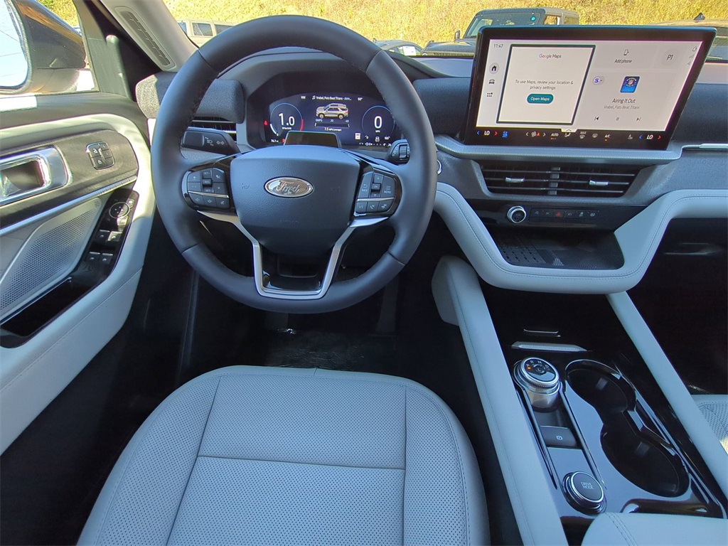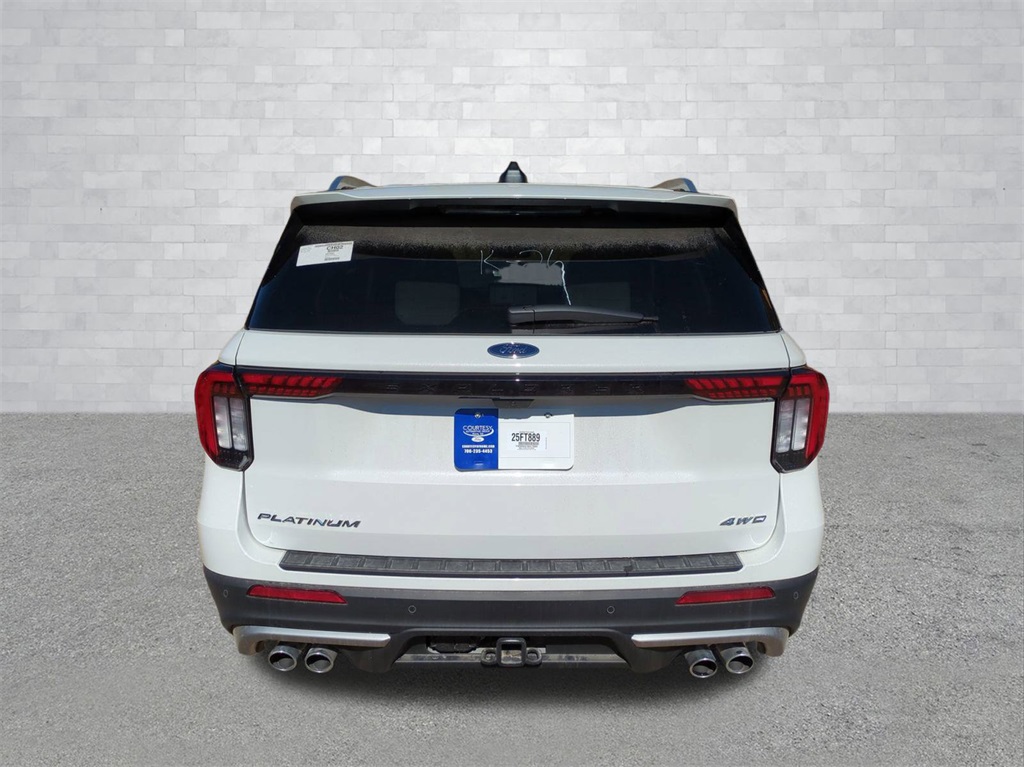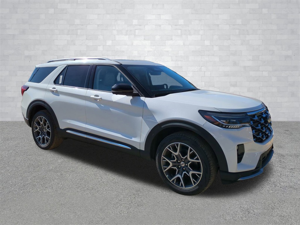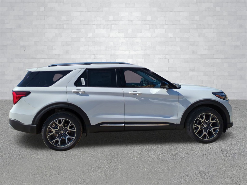 2025 Star White Metallic Tri-Coat 2025 Ford Explorer Platinum 4WD 3.0L EcoBoost V6 4WD. 4WD, 14 Speakers, 3.58 Non-Limited Slip Rear Axle, 3rd row seats: bench, 4-Wheel Disc Brakes, ABS brakes, ActiveX Trimmed Sport Captain's Chairs, Air Conditioning, Alloy wheels, AM/FM radio: SiriusXM with 360L, Apple CarPlay/Android Auto, Auto High-beam Headlights, Auto-dimming door mirrors, Auto-dimming Rear-View mirror, Automatic temperature control, Brake assist, Bumpers: body-color, Compass, Delay-off headlights, Driver door bin, Driver vanity mirror, Dual front impact airbags, Dual front side impact airbags, Electronic Stability Control, Emergency communication system: 911 Assist, Exterior Parking Camera Rear, Four wheel independent suspension, Front anti-roll bar, Front Bucket Seats, Front Center Armrest, Front dual zone A/C, Front fog lights, Front reading lights, Fully automatic headlights, Garage door transmitter, Heated door mirrors, Heated front seats, Heated rear seats, Heated steering wheel, Illuminated entry, Knee airbag, Leather steering wheel, Low tire pressure warning, Memory seat, Navigation System, Occupant sensing airbag, Outside temperature display, Overhead airbag, Overhead console, Panic alarm, Passenger door bin, Passenger vanity mirror, Power door mirrors, Power driver seat, Power Liftgate, Power moonroof, Power passenger seat, Power steering, Power windows, Radio data system, Radio: B&O Sound System by Bang & Olufsen w/HD, Rain sensing wipers, Rear air conditioning, Rear anti-roll bar, Rear reading lights, Rear window defroster, Rear window wiper, Remote keyless entry, Security system, Speed control, Speed-sensing steering, Speed-Sensitive Wipers, Split folding rear seat, Spoiler, Steering wheel mounted audio controls, Tachometer, Telescoping steering wheel, Tilt steering wheel, Traction control, Trip computer, Turn signal indicator mirrors, Variably intermittent wipers, Ventilated front seats, and Wheels: 20" Luster Nickel-Painted Aluminum Courtesy Ford and Lincoln of Rome 101 Hwy 411 E Rome, Ga 30161 ROMEFORDLINC.COM 706.235.4453.