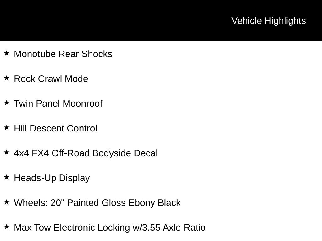 2025 Black Metallic 2025 Ford F-150 Platinum 4WD 3.5L V6 EcoBoost 12" LCD Productivity Touchscreen, 360-Degree Camera, 5G WiFi Hotspot Telematics, Adaptive Cruise Control, Auto LED Headlights, Backup Camera, Blind Spot Monitoring, BLIS w/ Cross Traffic Alert, Bluetooth w/ Audio Streaming, Cold Weather Package, Lane Departure Warning, Leather Seats, LED Foglights, Memory Package, Off Road Package, Panoramic Sunroof/Moonroof, Post Collision Braking, Power Running Boards, Power Sliding Rear Window, Pre Collision Assist w/ AEB, Premium Sound Package, Push Button Start, Remote Start, Reverse Brake Assist, Reverse Sensing, Tow Package, Trailer Package, 4D SuperCrew, 3.5L V6 EcoBoost, 10-Speed Automatic, 4WD, 4x4 FX4 Off-Road Bodyside Decal, Equipment Group 702A High, FX4 Off-Road Package, Heads-Up Display, Hill Descent Control, Max Tow Electronic Locking w/3.55 Axle Ratio, Monotube Rear Shocks, Navigation system: Connected Navigation, Off-Road Tuned Front Shock Absorbers, Radio: B&O Unleashed Sound System by Bang & Olufsen, Rock Crawl Mode, Twin Panel Moonroof, Wheels: 20" Painted Gloss Ebony Black. Equipment Group 702A High (Heads-Up Display, Radio: B&O Unleashed Sound System by Bang & Olufsen, and Twin Panel Moonroof), FX4 Off-Road Package (4x4 FX4 Off-Road Bodyside Decal, Hill Descent Control, Monotube Rear Shocks, Off-Road Tuned Front Shock Absorbers, and Rock Crawl Mode), 4D SuperCrew, 3.5L V6 EcoBoost, 10-Speed Automatic, 4WD, Max Tow Electronic Locking w/3.55 Axle Ratio, Navigation system: Connected Navigation, Wheels: 20" Painted Gloss Ebony Black, 4-Wheel Disc Brakes, 8 Speakers, ABS brakes, Adjustable pedals, Air Conditioning, Alloy wheels, Auto High-beam Headlights, Auto tilt-away steering wheel, Auto-dimming door mirrors, Auto-dimming Rear-View mirror, Automatic temperature control, Brake assist, Bumpers: body-color, Compass, Delay-off headlights, Driver door bin, Driver vanity mirror, Dual front impact airbags, Dual front side impact airbags, Electronic Stability Control, Emergency communication system: SYNC 4 911 Assist, Front anti-roll bar, Front Bucket Seats, Front Center Armrest, Front dual zone A/C, Front fog lights, Front License Plate Bracket, Front reading lights, Front wheel independent suspension, Fully automatic headlights, Garage door transmitter, Heated door mirrors, Heated front seats, Heated rear seats, Heated steering wheel, Illuminated entry, Leather steering wheel, Low tire pressure warning, Memory seat, Occupant sensing airbag, Outside temperature display, Overhead airbag, Overhead console, Panic alarm, Passenger door bin, Passenger vanity mirror, Pedal memory, Power door mirrors, Power driver seat, Power passenger seat, Power steering, Power windows, Radio data system, Radio: B&O Sound System by Bang & Olufsen, Rain sensing wipers, Rear reading lights, Rear seat center armrest, Rear step bumper, Rear window defroster, Remote keyless entry, Security system, Speed control, Split folding rear seat, Steering wheel memory, Steering wheel mounted audio controls, SYNC 4 w/Enhanced Voice Recognition, Tachometer, Telescoping steering wheel, Tilt steering wheel, Traction control, Trip computer, Turn signal indicator mirrors, Unique Multi-Contour Leather Bucket Seats, Variably intermittent wipers, Ventilated front seats, and Voltmeter Courtesy Ford and Lincoln of Rome 101 Hwy 411 E Rome, Ga 30161 ROMEFORDLINC.COM 706.235.4453. Price includes dealer added accessories.