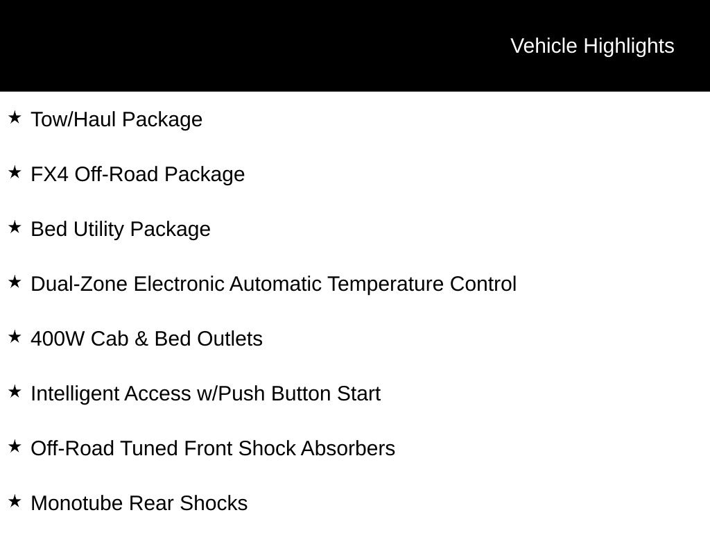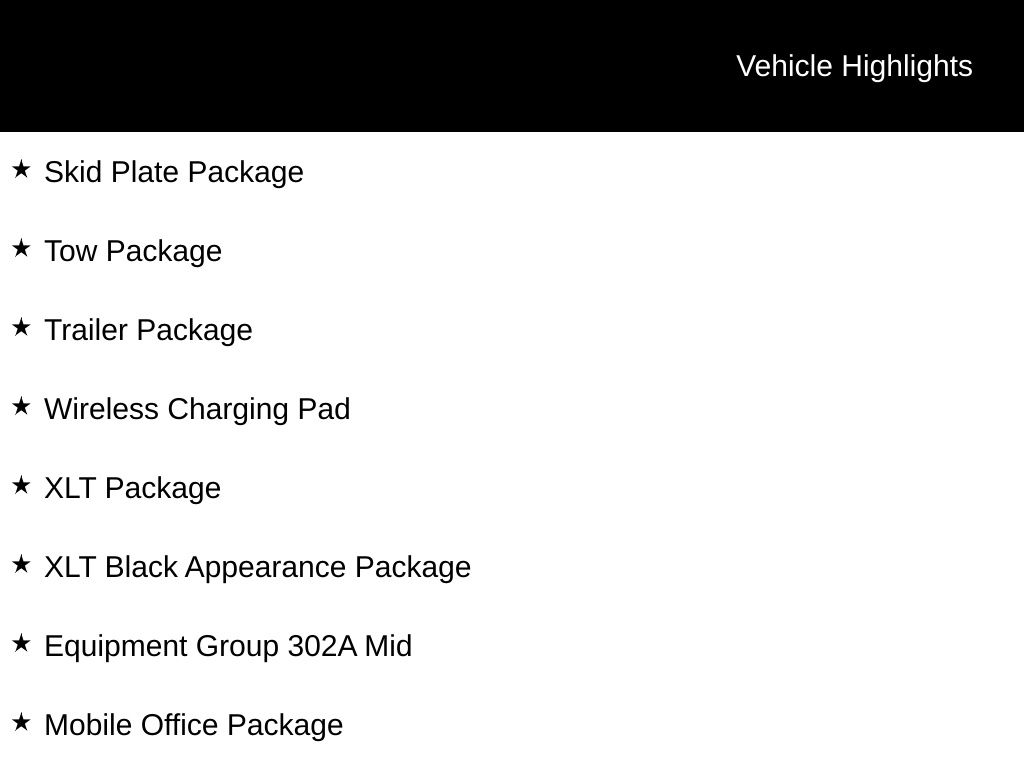 2025 Oxford White 2025 Ford F-150 XLT 4WD 3.5L PowerBoost Full-Hybrid V6 12" LCD Productivity Touchscreen, 5G WiFi Hotspot Telematics, Auto Emergency Braking, Auto LED Headlights, Backup Camera, Blind Spot Monitoring, BLIS w/ Cross Traffic Alert, Bluetooth w/ Audio Streaming, Lane Keeping System, Off Road Package, Parking Sensors, Post Collision Braking, Power Sliding Rear Window, Pre Collision Assist w/ AEB, Reverse Brake Assist, Reverse Sensing, Skid Plate Package, Tow Package, Trailer Package, Wireless Charging Pad, XLT Package, 4D SuperCrew, 3.5L PowerBoost Full-Hybrid V6, 10-Speed Automatic, 4WD, 360 Degree Camera, 4 Pickup Box Tie-Down Plates, 400W Cab & Bed Outlets, 4x4 FX4 Off-Road Bodyside Decal, 6" Angular Bright Anodized Step Bar, 6" Black Running Boards, Adaptive Cruise Control w/Stop & Go, Auto-Dimming Rear-View Mirror, Bed Utility Package, Black Exterior Badging, Black Grille, Black Painted Grille w/Chrome Center Bar, Body-Color Front & Rear Bumpers, Chrome Door & Tailgate Handles, Chrome Single-Tip Exhaust, Cloth 40/Console/40 Front Seats, Connected Navigation, Console Worksurface, Dark Interior Appliques, Driver State Detection, Dual-Zone Electronic Automatic Temperature Control, Electronic Locking w/3.73 Axle Ratio, Equipment Group 302A Mid, Evasive Steering Assist, Floor Shifter, Ford Co-Pilot360 Assist 2.0, Front Parking Sensors, FX4 Off-Road Package, Gray Box Side Decal, Heated Front Seats, Hill Descent Control, Integrated Trailer Brake Controller, Intelligent Access w/Push Button Start, LED Box Lighting, Mobile Office Package, Monotube Rear Shocks, Off-Road Tuned Front Shock Absorbers, Partitioned Lockable Rear Storage, Power Glass Heated Sideview Mirrors, Power-Sliding Rear Window, Remote Start System w/Remote Tailgate Release, Rock Crawl Mode, Tailgate Step w/Tailgate Work Surface, Tow/Haul Package, Towing Technology, Tray Style Floor Liner w/o Carpet Mats, Unique Sport Cloth 40/Console/40 Front-Seats, Wheels: 18" Gloss Black, Wrapped Steering Wheel, XLT Black Appearance Package. Bed Utility Package (4 Pickup Box Tie-Down Plates, LED Box Lighting, and Tailgate Step w/Tailgate Work Surface), Equipment Group 302A Mid (360 Degree Camera, 400W Cab & Bed Outlets, 6" Angular Bright Anodized Step Bar, Adaptive Cruise Control w/Stop & Go, Auto-Dimming Rear-View Mirror, Black Painted Grille w/Chrome Center Bar, Chrome Door & Tailgate Handles, Chrome Single-Tip Exhaust, Cloth 40/Console/40 Front Seats, Connected Navigation, Driver State Detection, Dual-Zone Electronic Automatic Temperature Control, Evasive Steering Assist, Ford Co-Pilot360 Assist 2.0, Front Parking Sensors, Heated Front Seats, Intelligent Access w/Push Button Start, Power Glass Heated Sideview Mirrors, Power-Sliding Rear Window, Remote Start System w/Remote Tailgate Release, Towing Technology, and Wrapped Steering Wheel), FX4 Off-Road Package (4x4 FX4 Off-Road Bodyside Decal, Hill Descent Control, Monotube Rear Shocks, Off-Road Tuned Front Shock Absorbers, Rock Crawl Mode, and Tray Style Floor Liner w/o Carpet Mats), Mobile Office Package (Console Worksurface and Partitioned Lockable Rear Storage), Tow/Haul Package (Integrated Trailer Brake Controller), XLT Black Appearance Package (6" Black Running Boards, Black Exterior Badging, Black Grille, Body-Color Front & Rear Bumpers, Dark Interior Appliques, Floor Shifter, Gray Box Side Decal, Unique Sport Cloth 40/Console/40 Front-Seats, and Wheels: 18" Gloss Black), 4D SuperCrew, 3.5L PowerBoost Full-Hybrid V6, 10-Speed Automatic, 4WD, Electronic Locking w/3.73 Axle Ratio, 4-Wheel Disc Brakes, 6 Speakers, ABS brakes, Air Conditioning, Alloy wheels, Auto High-beam Headlights, Brake assist, Bumpers: chrome, Chrome wheels, Cloth 40/20/40 Front Seat, Compass, Delay-off headlights, Driver door bin, Driver vanity mirror, Dual front impact airbags, Dual front side impact airbags, Electron Price includes dealer added acce