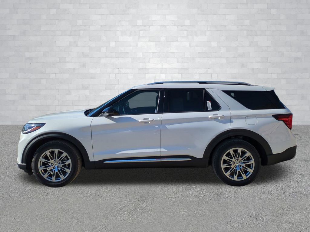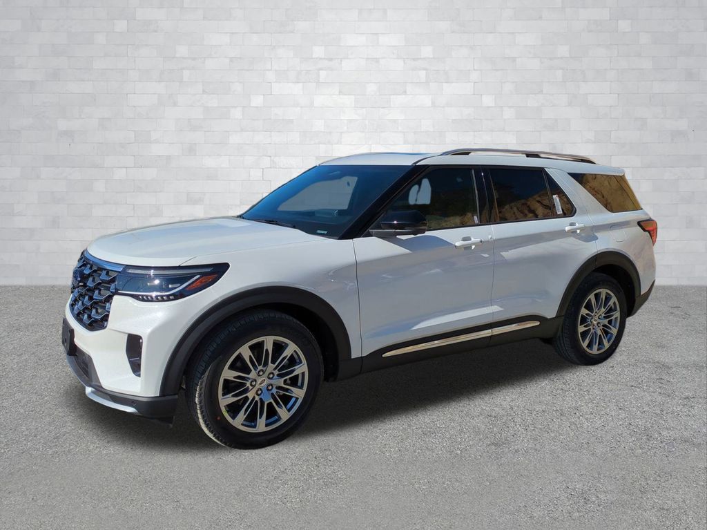 2026 Star White Metallic Tri-Coat 2026 Ford Explorer Platinum RWD 2.3L EcoBoost I-4 Equipment Group 600A Standard Package (ActiveX Trimmed Captain's Chairs, Radio: B&O Sound System by Bang & Olufsen with HD, and Wheels: 20" Luster Nickel-Painted Aluminum), Ford Connectivity Package (one-Time Purchase - 7 Years), 14 Speakers, 3rd row seats: bench, 4-Wheel Disc Brakes, ABS brakes, Air Conditioning, Alloy wheels, AM/FM radio: SiriusXM with 360L, Apple CarPlay/Android Auto, Auto High-beam Headlights, Auto-dimming door mirrors, Auto-dimming Rear-View mirror, Automatic temperature control, Brake assist, Bumpers: body-color, Compass, Delay-off headlights, Driver door bin, Driver vanity mirror, Dual front impact airbags, Dual front side impact airbags, Electronic Stability Control, Emergency communication system: 911 Assist, Exterior Parking Camera Rear, Four wheel independent suspension, Front anti-roll bar, Front Bucket Seats, Front Center Armrest, Front dual zone A/C, Front fog lights, Front License Plate Bracket, Front reading lights, Fully automatic headlights, Garage door transmitter, Heated door mirrors, Heated front seats, Heated rear seats, Heated steering wheel, Illuminated entry, Knee airbag, Leather steering wheel, Low tire pressure warning, Memory seat, Navigation System, Occupant sensing airbag, Outside temperature display, Overhead airbag, Overhead console, Panic alarm, Panoramic Fixed Glass Roof with Power Shade, Passenger door bin, Passenger vanity mirror, Power door mirrors, Power driver seat, Power Liftgate, Power passenger seat, Power steering, Power windows, Radio data system, Rain sensing wipers, Rear air conditioning, Rear anti-roll bar, Rear reading lights, Rear window defroster, Rear window wiper, Remote keyless entry, Security system, SiriusXM with 360L (3-Year Plan), Speed control, Speed-sensing steering, Speed-Sensitive Wipers, Split folding rear seat, Spoiler, Steering wheel mounted audio controls, Tachometer, Telescoping steering wheel, Tilt steering wheel, Traction control, Trip computer, Turn signal indicator mirrors, Variably intermittent wipers, and Ventilated front seats Courtesy Ford and Lincoln of Rome 101 Hwy 411 E Rome, Ga 30161 ROMEFORDLINC.COM 706.235.4453.