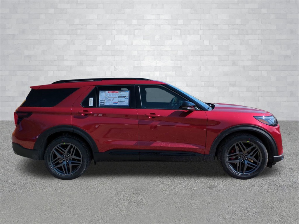 2026 Red Metallic 2026 Ford Explorer ST 4WD 3.0L EcoBoost V6 4WD. 4WD, 10 Speakers, 3rd row seats: bench, 4-Wheel Disc Brakes, ABS brakes, Air Conditioning, Alloy wheels, AM/FM radio: SiriusXM with 360L, Apple CarPlay/Android Auto, Auto High-beam Headlights, Auto-dimming door mirrors, Auto-dimming Rear-View mirror, Automatic temperature control, Brake assist, Bumpers: body-color, Compass, Delay-off headlights, Driver door bin, Driver vanity mirror, Dual front impact airbags, Dual front side impact airbags, Electronic Stability Control, Emergency communication system: 911 Assist, Exterior Parking Camera Rear, Four wheel independent suspension, Front anti-roll bar, Front Bucket Seats, Front Center Armrest, Front dual zone A/C, Front fog lights, Front reading lights, Fully automatic headlights, Garage door transmitter, Heated door mirrors, Heated front seats, Heated rear seats, Heated steering wheel, Heated/Ventilated Miko Suede Captain's Chairs, Illuminated entry, Knee airbag, Leather steering wheel, Low tire pressure warning, Memory seat, Navigation System, Occupant sensing airbag, Outside temperature display, Overhead airbag, Overhead console, Panic alarm, Passenger door bin, Passenger vanity mirror, Power door mirrors, Power driver seat, Power Liftgate, Power passenger seat, Power steering, Power windows, Radio: B&O Sound System by Bang and Olufsen, Rain sensing wipers, Rear air conditioning, Rear anti-roll bar, Rear reading lights, Rear window defroster, Rear window wiper, Remote keyless entry, Security system, Speed control, Speed-sensing steering, Speed-Sensitive Wipers, Split folding rear seat, Spoiler, Sport steering wheel, Steering wheel mounted audio controls, Tachometer, Telescoping steering wheel, Tilt steering wheel, Traction control, Trip computer, Turn signal indicator mirrors, Variably intermittent wipers, Ventilated front seats, and Wheels: 21" Magnetite-Painted Aluminum Courtesy Ford and Lincoln of Rome 101 Hwy 411 E Rome, Ga 30161 ROMEFORDLINC.COM 706.235.4453.