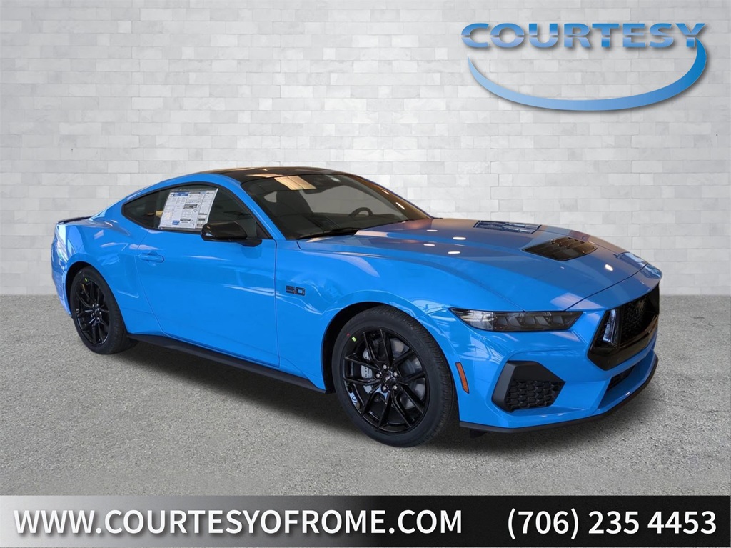 2026 Grabber Blue Metallic 2026 Ford Mustang GT RWD 5.0L V8 Ti-VCT ABS brakes, Alloy wheels, Compass, Electronic Stability Control, Front dual zone A/C, Illuminated entry, Low tire pressure warning, Remote keyless entry, Traction control. ABS brakes, Alloy wheels, Compass, Electronic Stability Control, Front dual zone A/C, Illuminated entry, Low tire pressure warning, Remote keyless entry, Traction control, 4-Wheel Disc Brakes, 6 Speakers, Air Conditioning, AM/FM radio, AM/FM Stereo, Auto High-beam Headlights, Automatic temperature control, Brake assist, Bumpers: body-color, Cloth Bucket Seats, Delay-off headlights, Driver door bin, Driver vanity mirror, Dual front impact airbags, Dual front side impact airbags, Emergency communication system: 911 Assist, Exterior Parking Camera Rear, Four wheel independent suspension, Front anti-roll bar, Front Bucket Seats, Front Center Armrest, Front reading lights, Fully automatic headlights, Knee airbag, Leather Shift Knob, Leather steering wheel, Occupant sensing airbag, Outside temperature display, Overhead airbag, Overhead console, Panic alarm, Passenger door bin, Passenger vanity mirror, Power door mirrors, Power steering, Power windows, Radio data system, Rain sensing wipers, Rear anti-roll bar, Rear Parking Sensors, Rear window defroster, Speed control, Speed-sensing steering, Speed-Sensitive Wipers, Split folding rear seat, Sport steering wheel, Steering wheel mounted audio controls, SYNC 4, Tachometer, Telescoping steering wheel, Tilt steering wheel, Trip computer, Variably intermittent wipers, and Voltmeter Courtesy Ford and Lincoln of Rome 101 Hwy 411 E Rome, Ga 30161 ROMEFORDLINC.COM 706.235.4453.