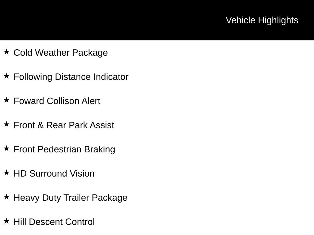 - Adaptive Cruise Control, Android Auto, Apple CarPlay, Auto Emergency Braking, Auto LED Headlights, Backup Camera, Bose High End Sound Package, Cold Weather Package, Forward Collision Alert, Front & Rear Park Assist, HD Surround Vision, Heavy Duty Trailer Package, Lane Departure Warning, Lane Keeping System, Leather Seats, Off Road Package, Parking Sensors, Premium Sound Package, Rear Cross Traffic Alert, Remote Start, Reverse Brake Assist, Safety Package, Skid Plate Package, Trailer Side Blind Zone Alert, Wireless Charging Pad