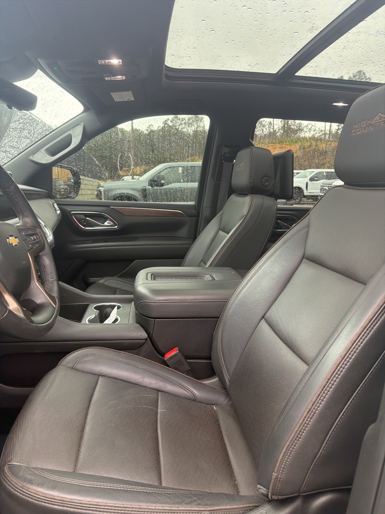 Sterling Gray Metallic 2023 Chevrolet Tahoe High Country 4WD 4WD High Country 4WD 10.25" Color Touchscreen, 3rd Row Seating, Active Park Assist, Adaptive Cruise Control, Android Auto, Apple Carplay, Auto Emergency Braking, Auto LED Headlights, Backup Camera, Blind Spot Monitoring, Bluetooth w/ Audio Streaming, Bose High End Sound Package, Cold Weather Package, DVD Entertainment Package, Following Distance Indicator, Foward Collison Alert, Front Pedestrian Braking, HD Surround Vision, Hitch Guidance w/ Hitch View, Lane Departure Warning, Lane Keeping System, Leather Seats, Mechanical Limited Slip Differential, Memory Package, Multi Zone Climate Control, Multimedia Package, Panoramic Sunroof/Moonroof, Parking Sensors, Power Mirror Package, Power Package, Preferred Equipment Package, Premium Sound Package, Rear Climate Package, Rear Cross Traffic Alert, Reverse Brake Assist, Reverse Sensing, Safety Package, Tow Package, Trailer Package, Trailer Side Blind Zone Alert, 4D Sport Utility, EcoTec3 6.2L V8, 10-Speed Automatic with Overdrive, 4WD, 10 Speakers, 15" Diagonal Multi-Color Head-Up Display, 1st & 2nd Row Color-Keyed Carpeted Floor Mats, 2-Speed Active Electronic AutoTrac Transfer Case, 3rd Row 60/40 Power-Folding Split-Bench Seat, 4-Wheel Disc Brakes, ABS brakes, Adaptive Cruise Control, Adaptive suspension, Advanced Technology Package, Advanced Trailering Package, Air Ride Adaptive Suspension, AM/FM radio: SiriusXM with 360L, Apple CarPlay/Android Auto, Auto High-beam Headlights, Auto-dimming door mirrors, Auto-dimming Rear-View mirror, Auto-leveling suspension, Automatic temperature control, Bose 10-Speaker Centerpoint Surround Audio Sys Ft, Brake assist, Bright Front & Rear Door Sill Plates, Chrome Door Handles w/Body-Color Strip, Color-Keyed Carpeting Floor Covering, Compass, Delay-off headlights, Driver & Front Outboard Passenger Airbags, Dual Exhaust System, Dual-Pane Power Panoramic Sunroof, Electronic Stability Control, Emergency communication system: OnStar and Chevrolet connected services capable, Enhanced Automatic Emergency Braking, Enhanced Automatic Parking Assist, Enhanced Driver Information Center, Exterior Parking Camera Rear, Extra Capacity Cooling System, Floor Console, Four wheel independent suspension, Front Center Armrest, Front dual zone A/C, Front High-Back Reclining Bucket Seats, Fully automatic headlights, Garage door transmitter, Hands-Free Rear Power Programmable Liftgate, HD Surround Vision, Heads-Up Display, Heated & Ventilated Driver & Front Passenger Seats, Heated 2nd Row Outboard Seats, Heated door mirrors, Heated Driver & Front Passenger Seats, Heated Steering Wheel, Heated steering wheel, Hill Descent Control, Hitch Guidance w/Hitch View, Illuminated entry, Infotainment Display, Inside Rearview Auto-Dimming Rear Camera Mirror, Integrated Trailer Brake Controller, Lane Change Alert w/Side Blind Zone Alert, LED Daytime Running Lamps, Low tire pressure warning, Magnetic Ride Control Suspension, Max Trailering Package, Memory seat, Memory Settings, Navigation System, Outside Heated Power-Adjustable Mirrors, Outside temperature display, Overhead console, Panic alarm, Perforated Leather Seat Trim, Power door mirrors, Power Liftgate, Power passenger seat, Power Release 2nd Row Bucket Seats, Power Tilt & Telescopic Steering Column, Preferred Equipment Group 3LZ, Premium audio system: Chevrolet Infotainment 3 Premium, Radio: Chevrolet Infotainment 3 Premium System, Rain sensing wipers, Rear air conditioning, Rear Camera Mirror Washer, Rear Cross Traffic Alert, Rear Pedestrian Alert, Rear Seat Media System, Rear window wiper, Remote keyless entry, Remote Start, Reverse Automatic Braking, Roof rack: rails only, Safety Alert Seat, Set of 4 Wheel Locks (LPO), SiriusXM Radio w/360L, Smart Trailer Integra