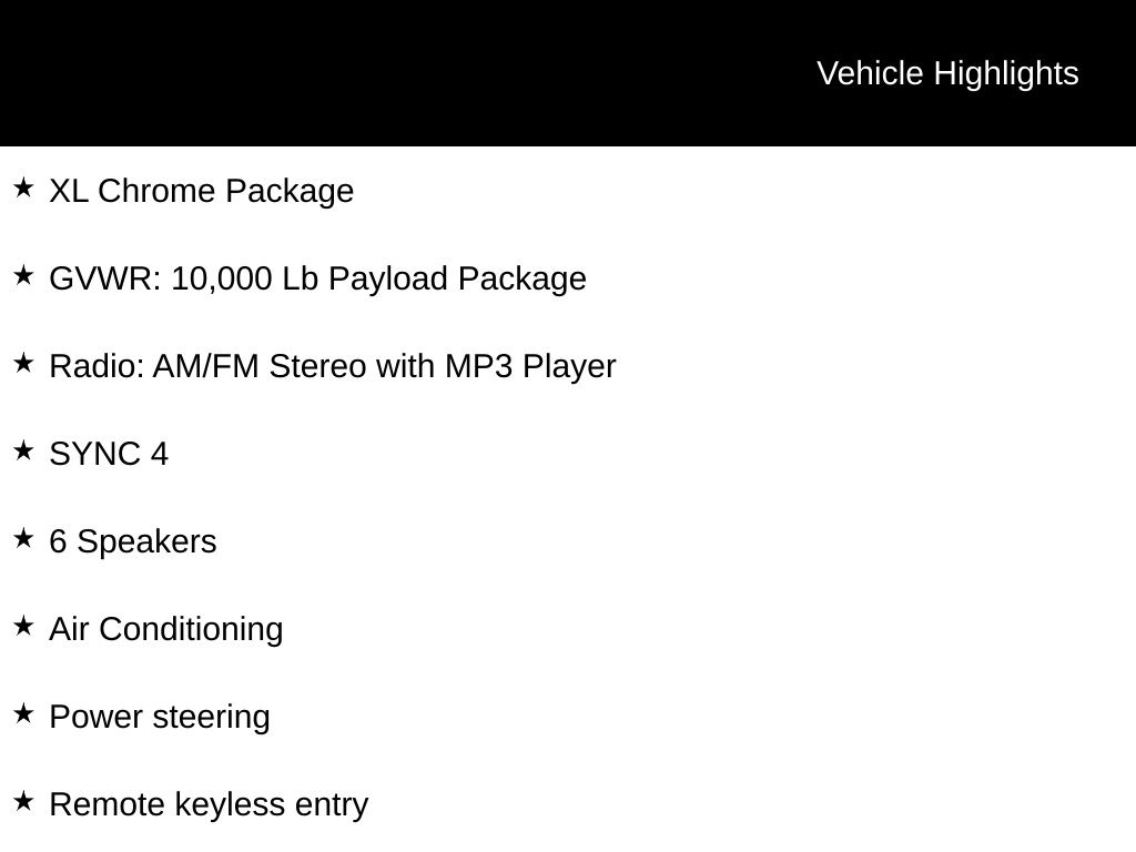 The interior is packed with features that will make your workday more comfortable and efficient, including SYNC 4, air conditioning, power windows and locks, and a premium audio system. And with the 6 upfitter switches, you can easily customize this truck to fit your specific needs.